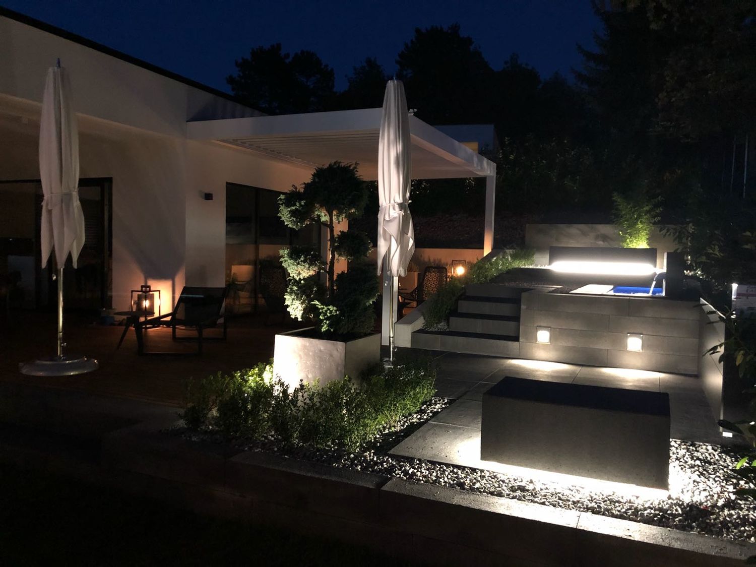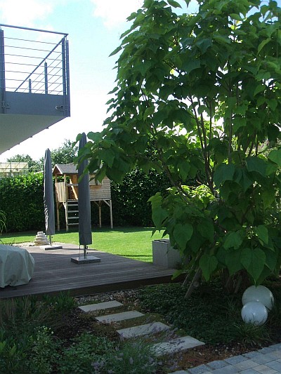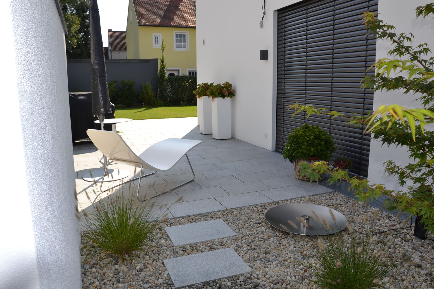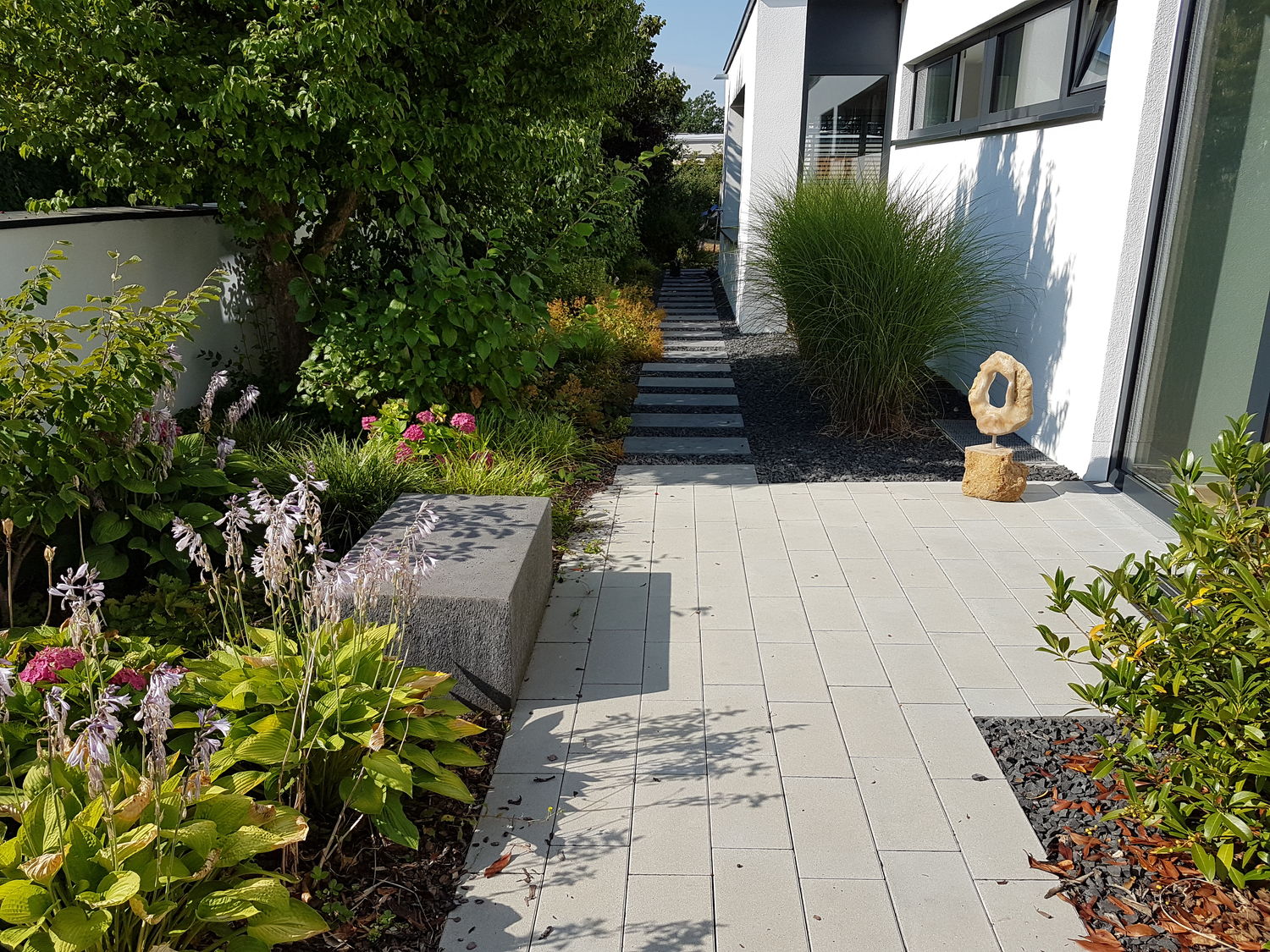 Ein moderner Garten zeichnet sich fast immer durch die Verwendung gerader, fast architektonisch wirkender Linien und Strukturen aus und korrespondiert mit dem Baukörper. Die Zusammenstellung der Pflanzen orientiert sich an formalen Überlegungen. Häufig werden nur wenige Arten, diese aber in großen Stückzahlen, verwendet. Oder als besonderer Hingucker ein exklusiver Gartenbonsai oder ein anderes Formschnittgehölz.Akkurate Rasenkanten verstärken das Gesamtbild der Ordnung.