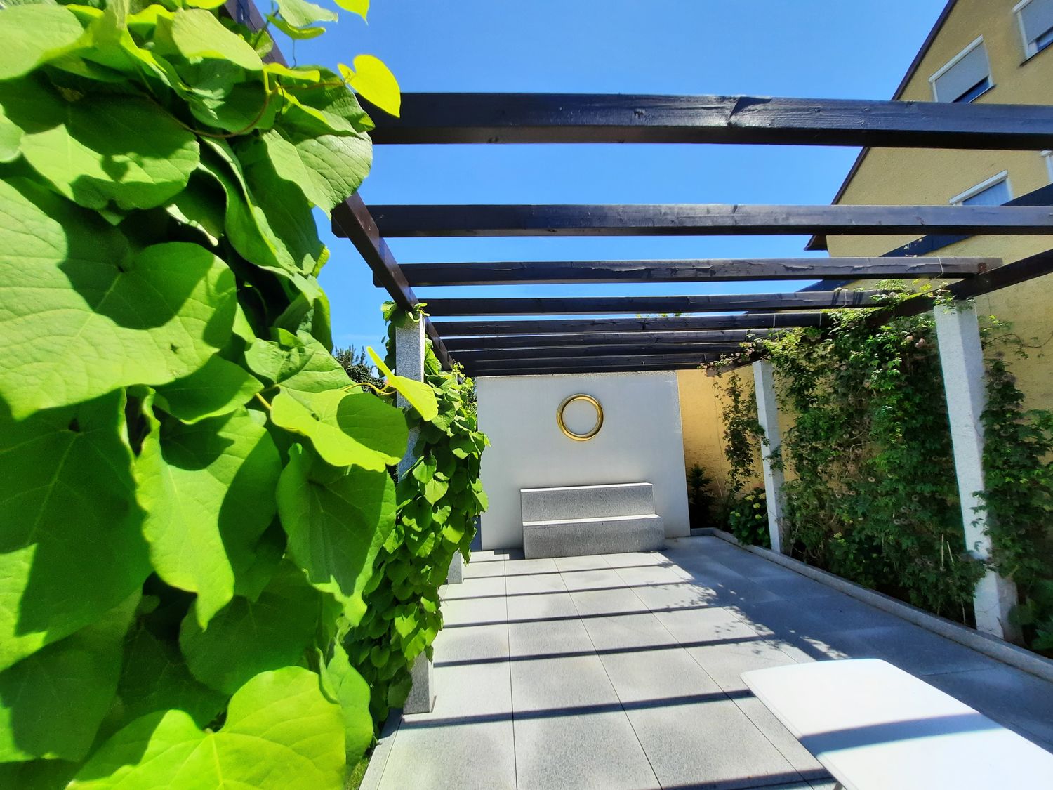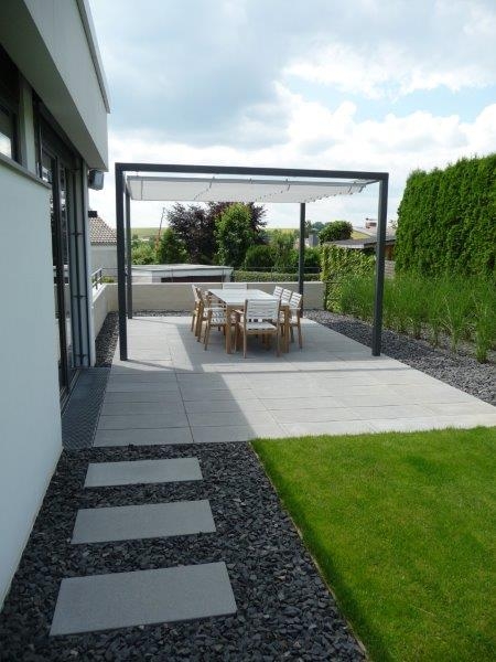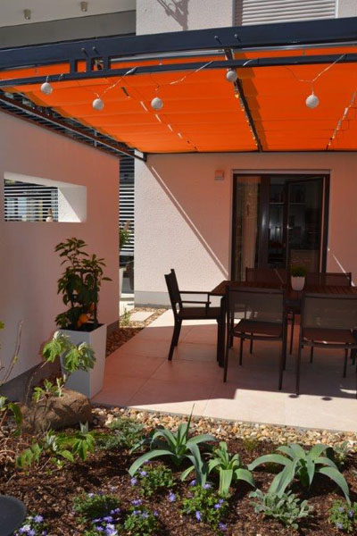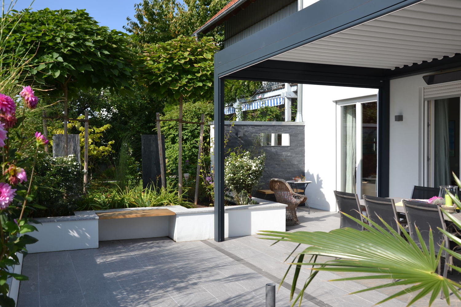 Sitzplätze unter modernen, schlichten Pergolen mit Beschattungssystemen könnten zu Ihrem Lieblingsplatz im Garten werden.