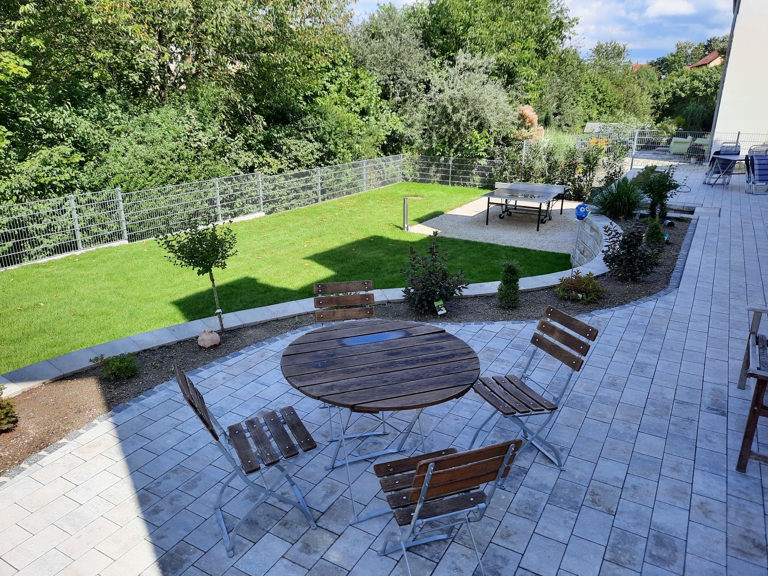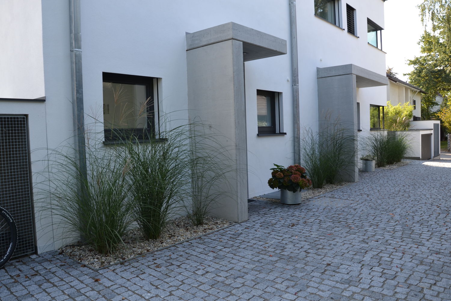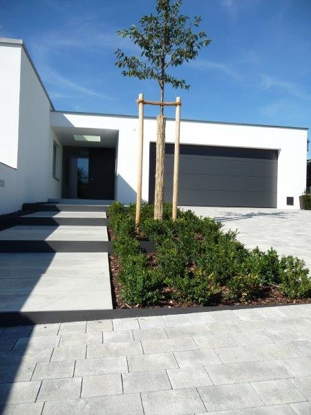 Wir verwenden moderne Baustoffe wie Stahl (z.Bsp als Einfassungen) und großformatige Beläge.