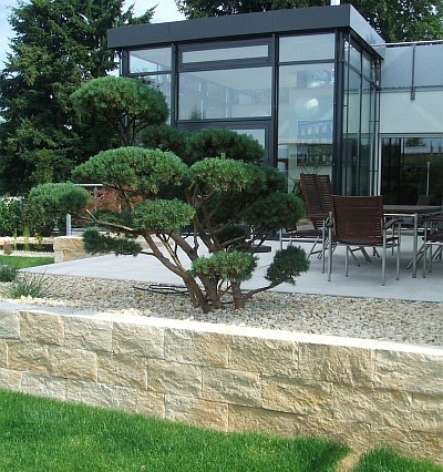 Ein moderner Garten zeichnet sich fast immer durch die Verwendung gerader, fast architektonisch wirkender Linien und Strukturen aus und korrespondiert mit dem Baukörper. Die Zusammenstellung der Pflanzen orientiert sich an formalen Überlegungen. Häufig werden nur wenige Arten, diese aber in großen Stückzahlen, verwendet. Oder als besonderer Hingucker ein exklusiver Gartenbonsai oder ein anderes Formschnittgehölz.Akkurate Rasenkanten verstärken das Gesamtbild der Ordnung.